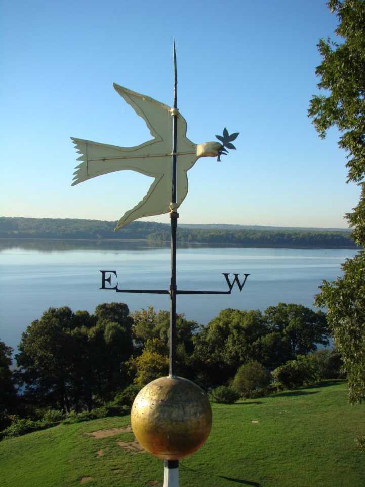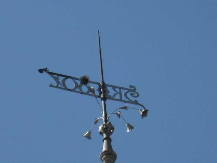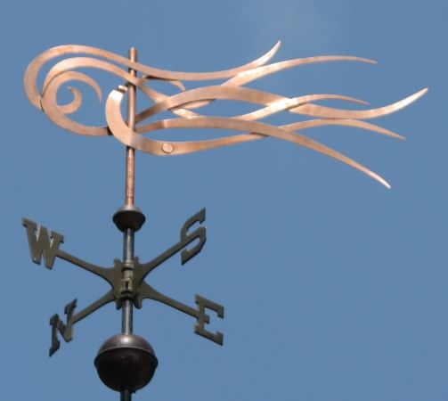 Верхушку флюгера принято украшать розой ветров – это тонкие металлические трубочки, которые указывают на стороны света. Сверху же флюгер обычно накрывают защитным колпаком, но не всегда.