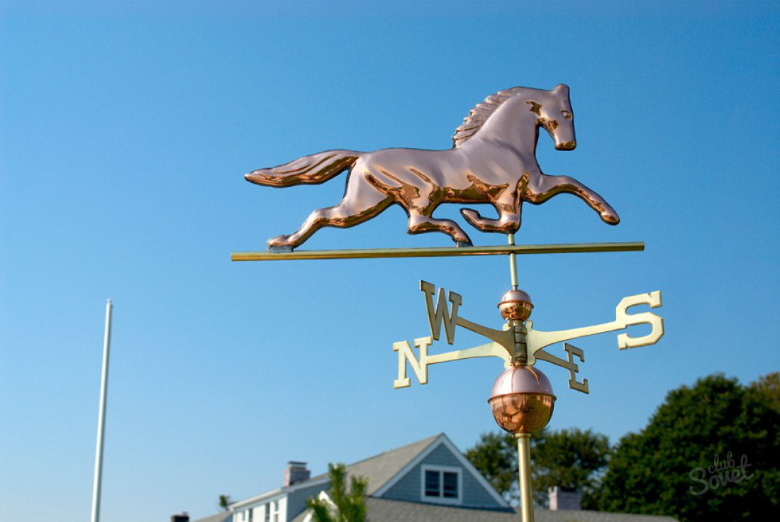 Стандартный флюгер представляет собой основание, которое неподвижно закрепляется на крыше дома, стрелки указателя, которые показывают направление ветра и саму фигурку, плюс подвижную часть флюгера.