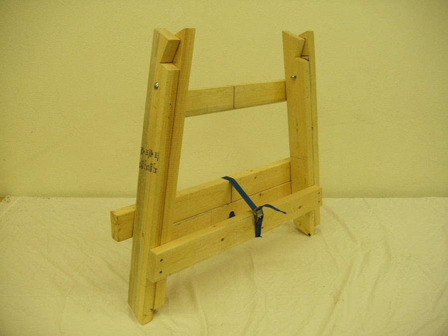 8. Переверните подмости и обрежьте концы ног козлов, торчащие над верхней площадкой, как показано на рисунке (три обрезано, один торчит).