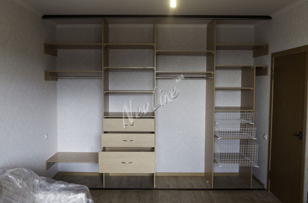 Поэтому отделение, где расположены выдвижные ящики, обычно делают немного уже по сравнению с остальными секциями. Секции с выдвижными механизмами лучше всего размещать не по центру, а по разные стороны шкафа-купе, т.е. к боковым стенкам. Так вы избежите неприятной ситуации с открыванием ящика, который при неправильном расположении будет упираться в двери шкафа купе.