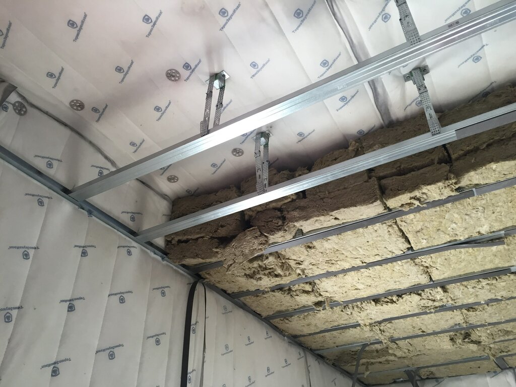 - Затем к потолку на расстоянии примерно 10 см от слоя звукоизоляционного материала крепится конструкция натяжного потолка, делается электроразводка.